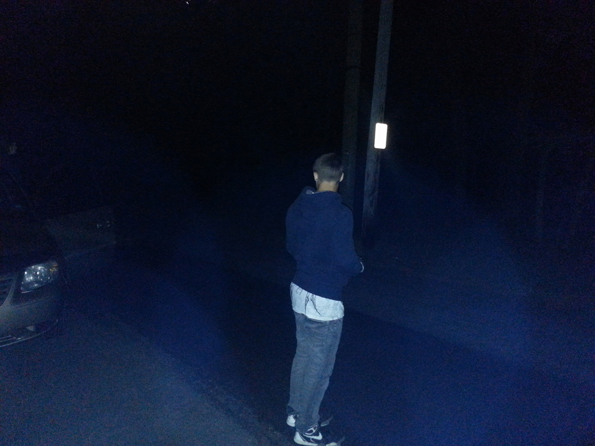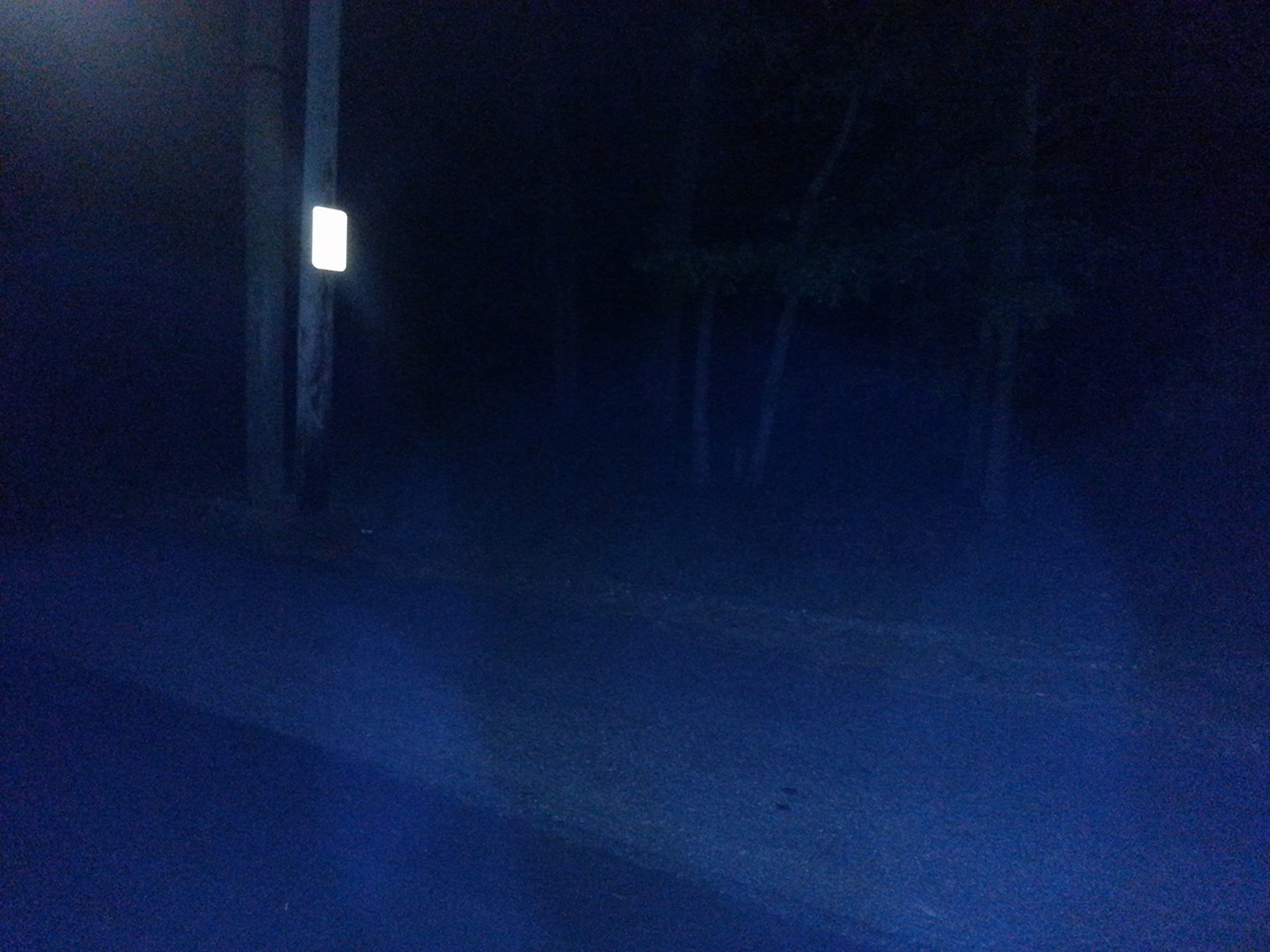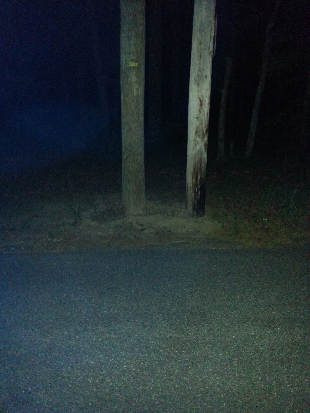 must honk the horn. We went ther at 12:30 am. We got out of our vehicle and walked around. Moments after being there about 6 large orbs came down the street to us. They circled my son Jeremy. I had him stand still while I recording them. Not even a minute passed and the orbs moved back towards the woods. The street is in total darkness as can be seen in the photos. |